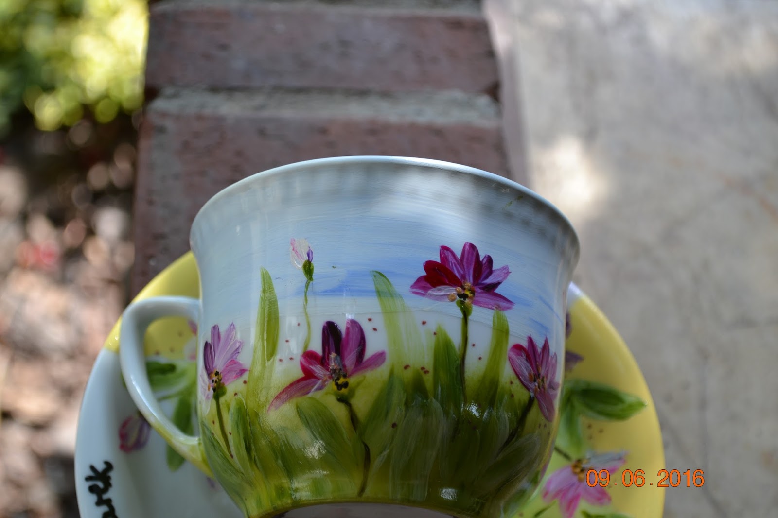 Zaczarowany ogród można uwiecznić za pomocą obiektywu jak i za pomocą pędzla. Kwiaty to wdzięczny temat, węc często goszczą na filiżankach i kubkach.